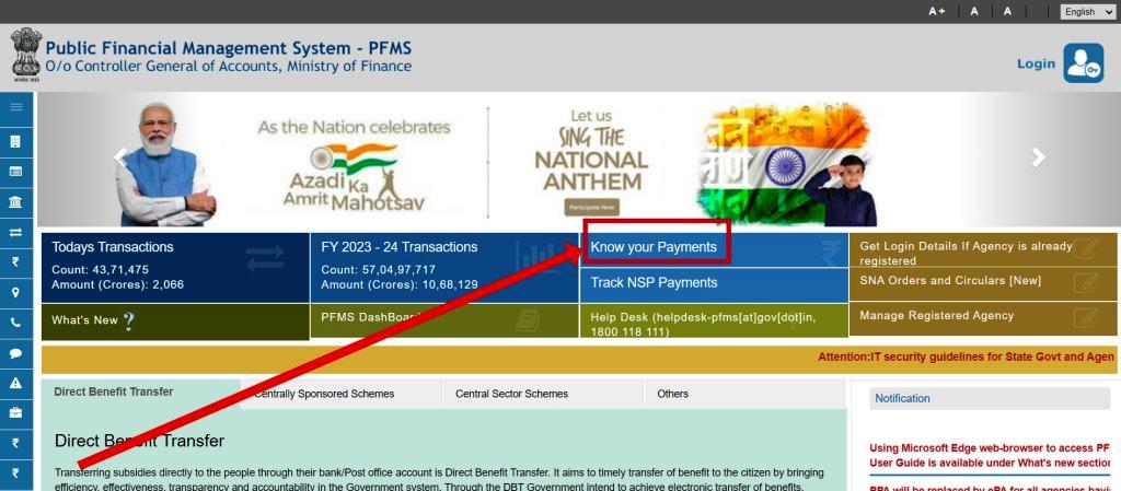 - अपने एंड्रॉयड स्मार्टफोन या कंप्यूटर में वेबसाइट https://pfms.nic.in/ खोलें, इस प्रकार दिखेगा –